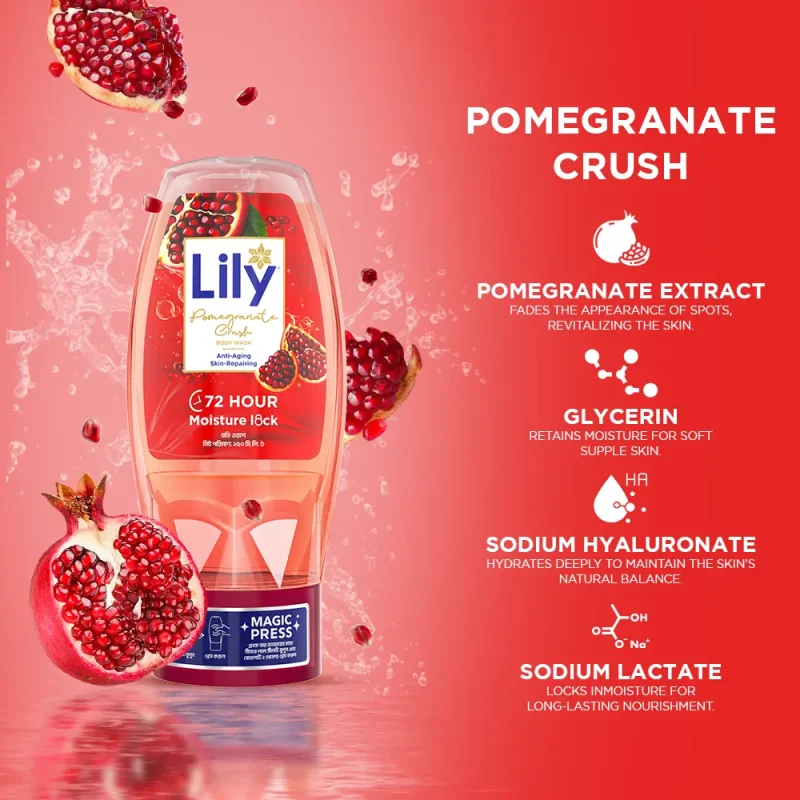 Lily Pomegranate Liquid Gel Wash provides a calming sensation with every wash. Infused with the beneficial properties of pomegranate, it diminishes spots, eliminates toxins, soothes dry skin, and ensures a long-lasting moisture lock for enduring freshness.